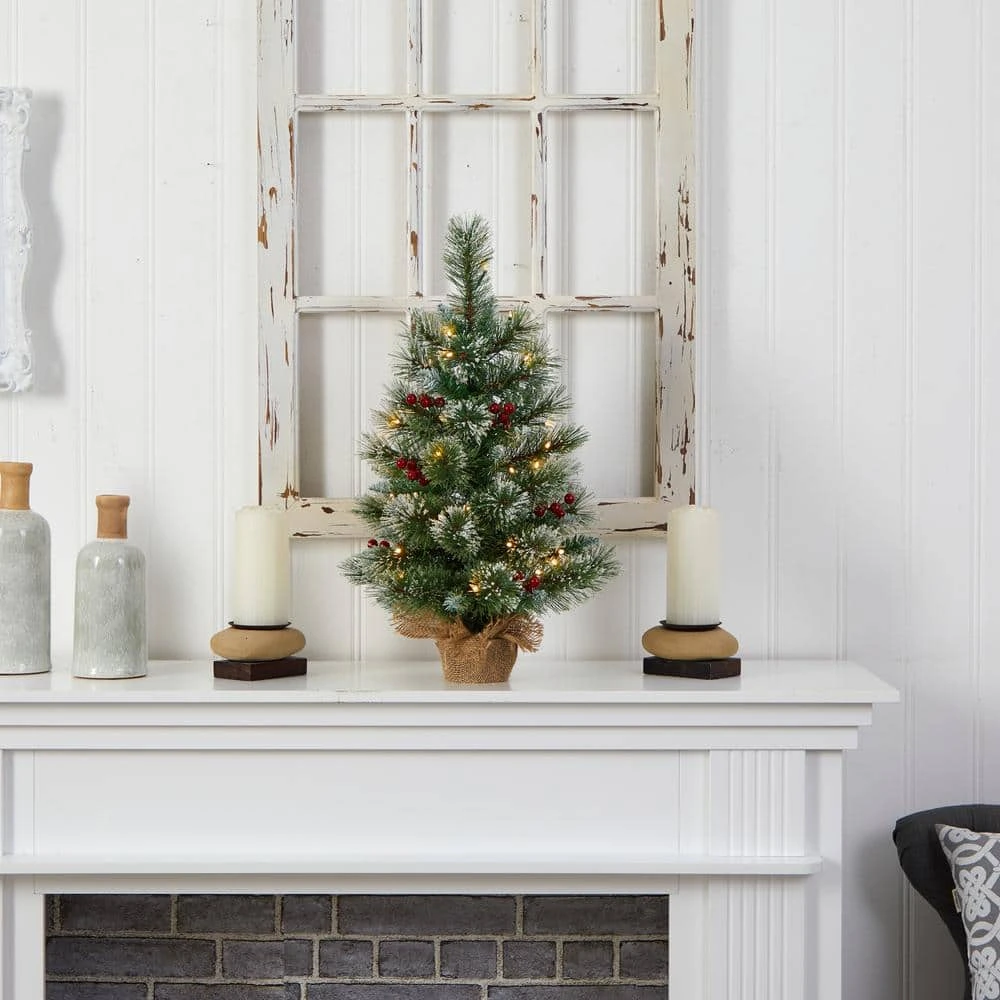 Spread holiday cheer to any tabletop with this artificial Pine Berry Christmas Tree. Lush, PVC needles are lightly dusted with snow and accented throughout with berries that look incredibly lifelike. This mini faux tree comes pre-lit with 35 lights and 50 bendable branches to save you time and money. Standing 2 ft. from a burlap base for a rustic vibe, house in any area. Perfect for an office, desktop or any tight area. Faux Christmas Trees are manufactured using synthetic materials, such as polyester material or plastic, and are well designed and constructed to be life-like in appearance. This item will need to be re-shaped when removed from the secure box to allow it to reach its fullest size. Your artificial Christmas Tree will look beautiful for years to come; simply wipe clean with a soft dry cloth when needed.