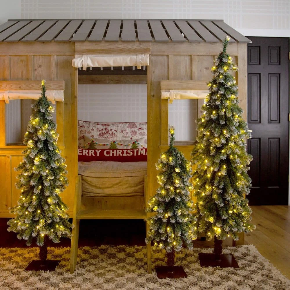 - Each tree comes pre-lit with warm white LED energy-efficient lights for a stunning display (3 ft. tree 50 LED lights, 4 ft. tree 100 LED lights and 5 ft. tree 150 LED lights)