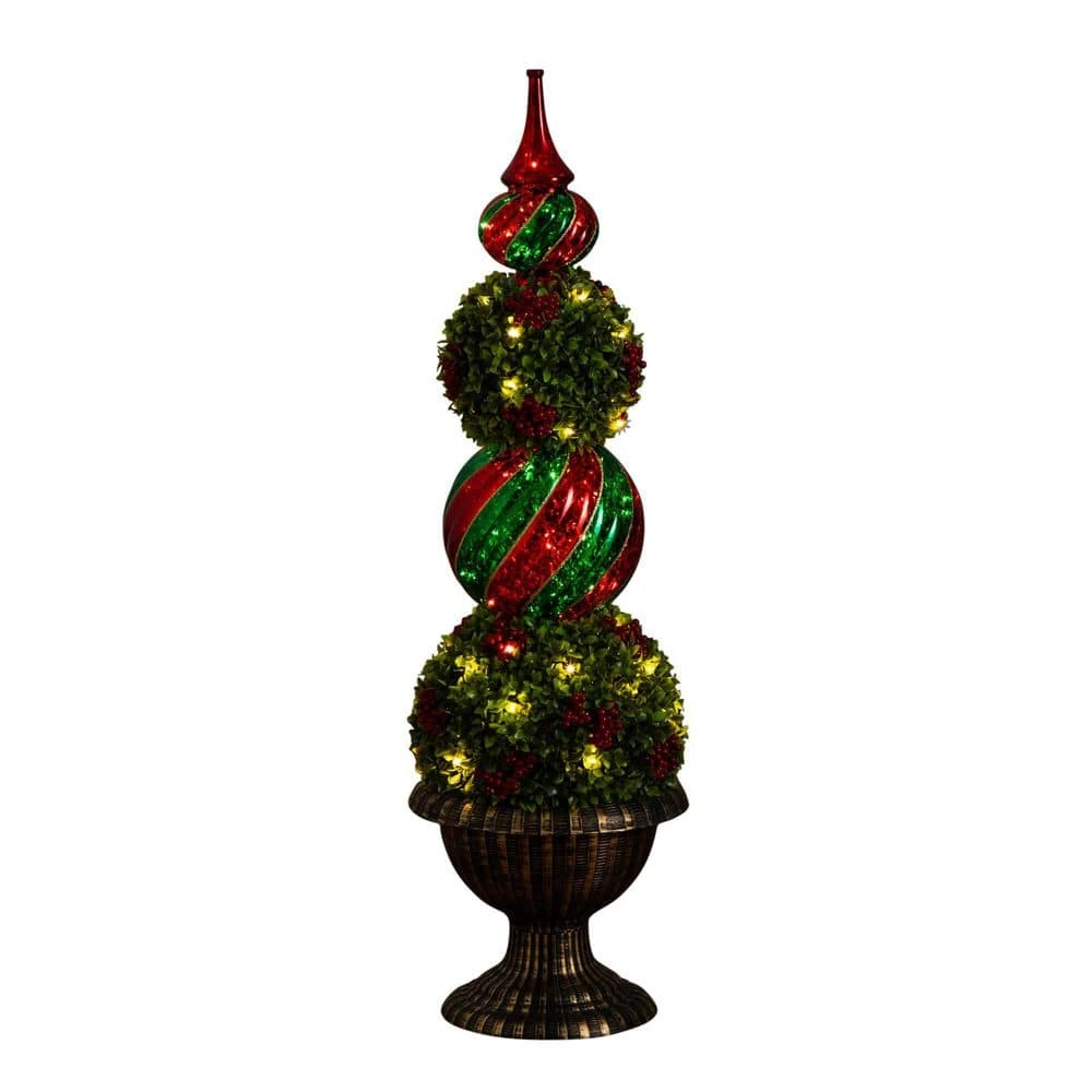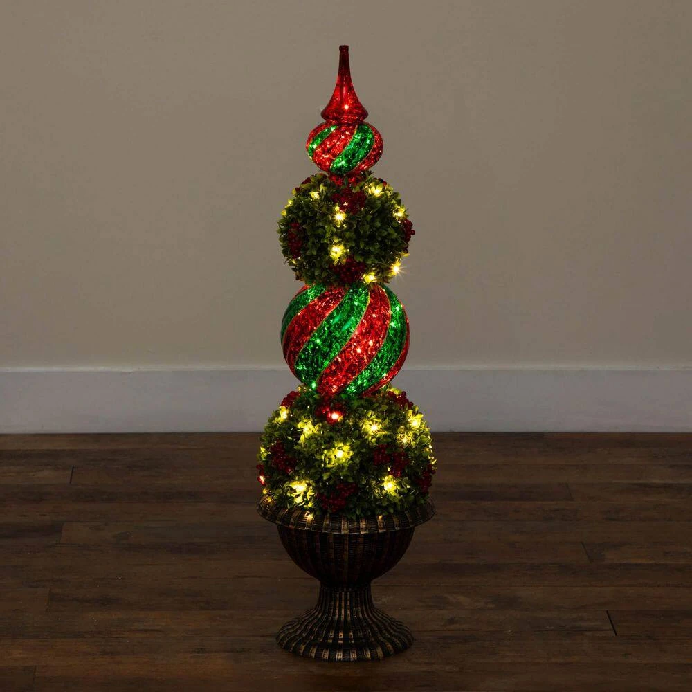 Transform your holiday decor with this unique artificial Christmas ornament boxwood topiary tree a stunning statement piece that perfectly balances traditional Christmas charm with refined elegance. Inspired by the classic holiday movies from your childhood, this tree combines the natural beauty of the season with the hues of the season, while the green provides warmth, and the berries bring an organic touch. Crafted from high-quality materials, bend the branches to fit in your space. Accented with 70 LED lights, this faux tree transports you to your favorite amusement park for a warm glow. Standing 3 ft. from a decorative planter with gold trimmings, display in any area in need of some Christmas cheer.