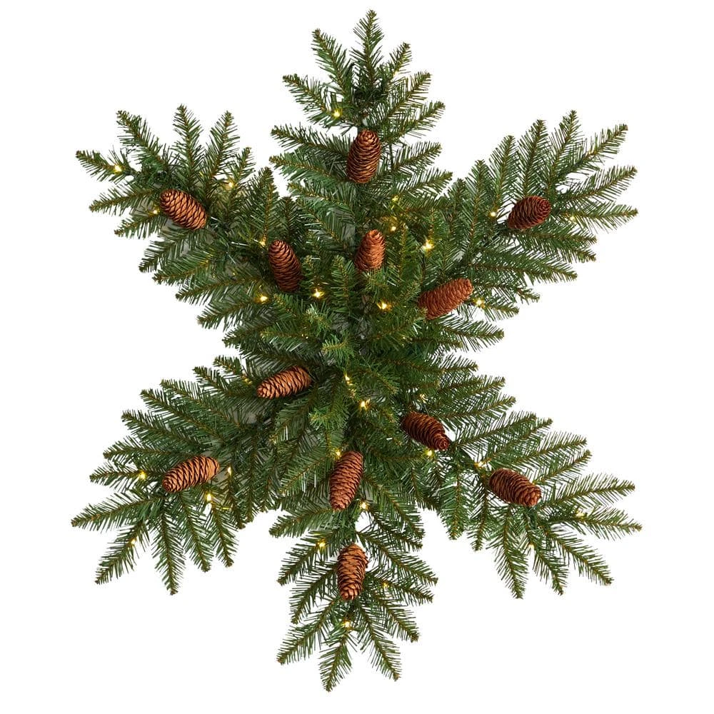 Have some whimsical fun this holiday season with a Pre-Lit Snowflake Artificial Dunhill Fir Wreath with Pinecones. Be bold and different by displaying evergreens in a star shape inspired by nature that mimics real trees’ foliage and texture. Pre-lit with 40 LED lights that are more energy efficient create a cozy scene with the family. Pinecones adorn the 120 bendable branches for a rustic look. With a diameter of 30 in., house in any bare wall or door. Artificial wreaths are manufactured using synthetic materials, such as polyester material or plastic, and are well designed and constructed to be life-like in appearance. This item will need to be re-shaped when removed from the secure box to allow it to reach its fullest size. Your wreath will look beautiful for years to come, simply wipe clean with a soft dry cloth when needed.