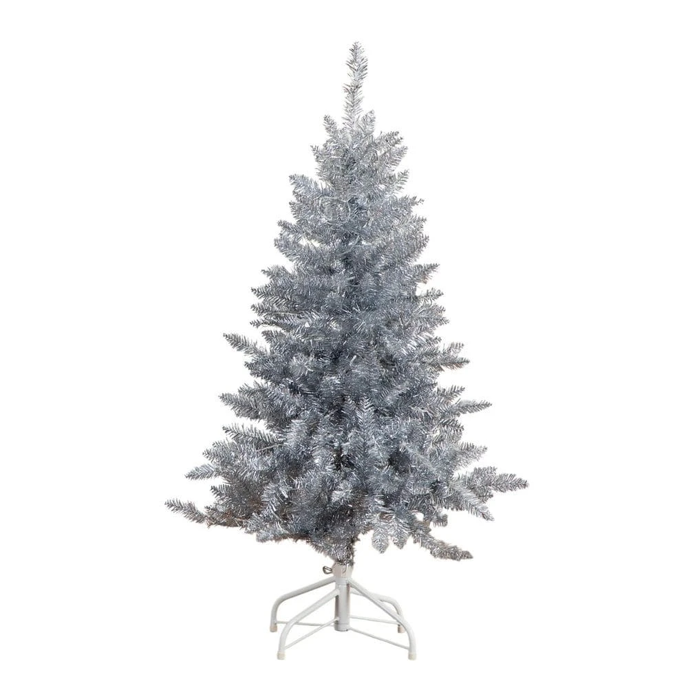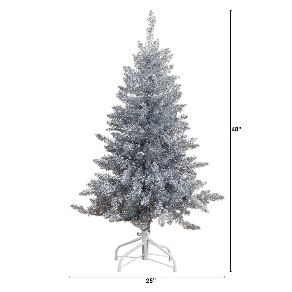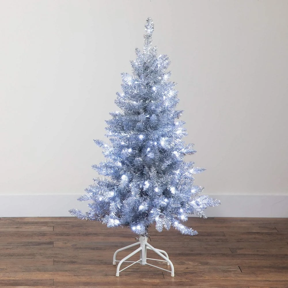 Reminisce on the days of yesteryear where groovy was in and Christmas was en vogue. This artificial silver Christmas tree captures the nostalgic charm of mid-century holiday decor while adding a contemporary cool white LED glow for a modern celebration. Crafted from high-quality materials, the silver finish adds glamour with a vintage twist that complements many decor styles. Pre-strung with 130 cool white LED lights nestled among the tinsel branches, feel the nostalgic radiate your space. Standing 4 ft. from a sturdy stand, create conversation during the holidays. Great for apartments, small spaces, or as secondary trees in larger homes.