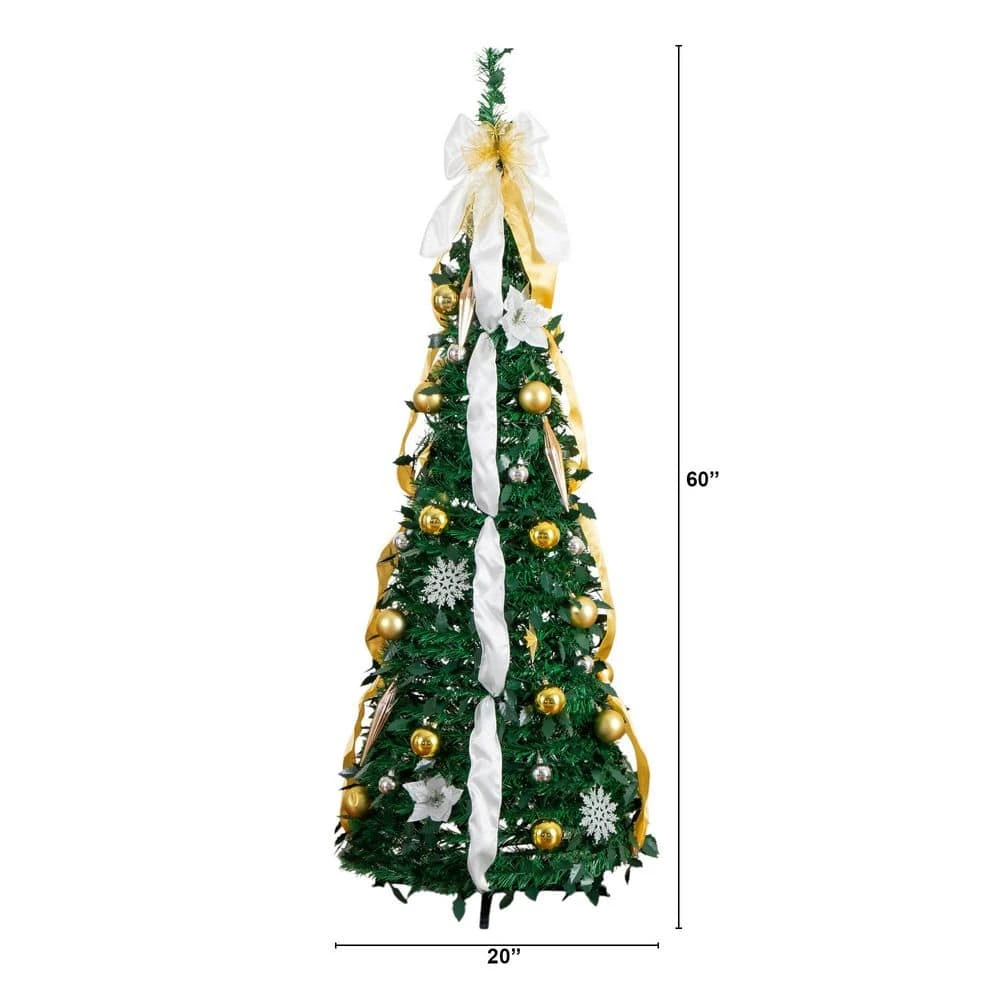 Add a touch of festive elegance to your space with the dazzling 5 ft. pre-lit artificial pop-up Christmas tree. Adorned with gold and silver ornaments, shimmering ribbons, and an evergreen silhouette, this tree exudes a sophisticated holiday charm that will bring the magic of the season into any room. 100 warm white LED lights twinkle through the lush branches, casting a cozy and inviting glow. Its sleek, full shape strikes the perfect balance between classic elegance and modern flair, making it ideal for creating a stylish holiday display. The best part is its easy-to-install design. Not only does it come pre-lit and pre-decorated, but its simple pull-down mechanism makes it the most effortless Christmas tree on the market. Easy to Install: This tree features a convenient pull-down design for hassle-free setup. Simply start by assembling the stand, then gently place the tree on top. Pull the tree down from top to bottom, plug it in, and adjust the ornaments and ribbons to your liking. In just a few minutes, your fully decorated, pre-lit tree will be ready to spread holiday cheer with ease.