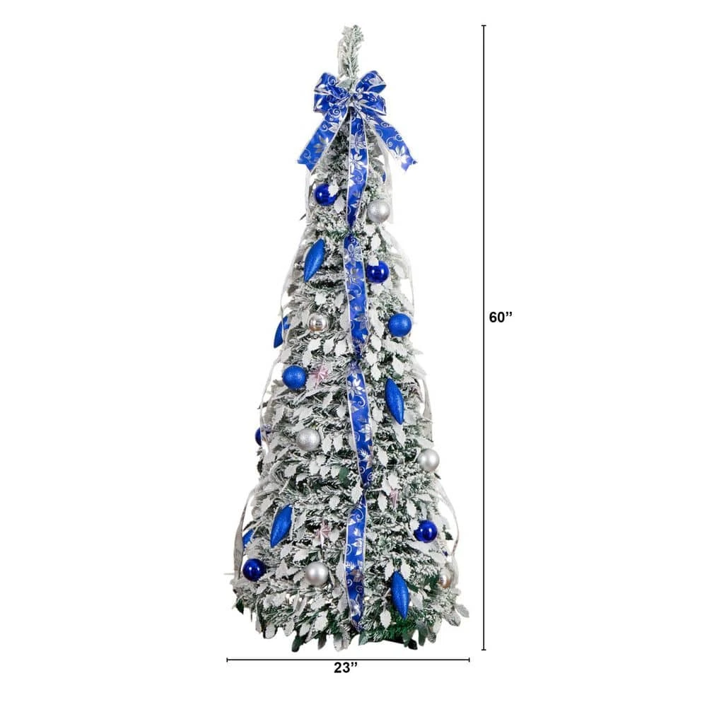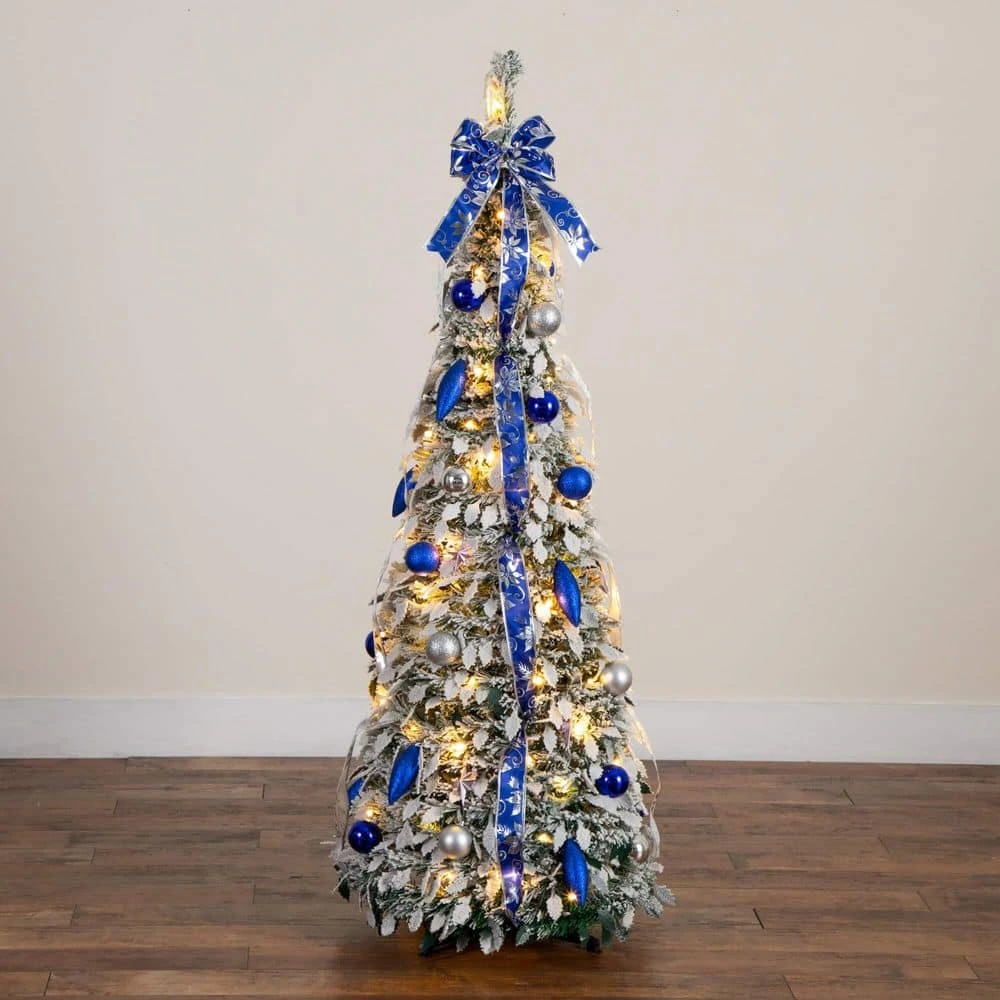 Add a touch of festive elegance to your space with the dazzling 5 ft. pre-lit artificial pop-up flocked Christmas tree. Adorned with silver and blue ornaments, shimmering ribbons, and a frosted flocked finish, this tree exudes a winter wonderland vibe that will bring holiday magic to any room. 100 warm white LED lights twinkle through the flocked like branches, casting a cozy, inviting glow. The sleek, full shape makes it the perfect balance of classic charm and modern flair, ideal for creating a sophisticated holiday display. The best part is its easy-to-install ability. Not only does it come pre-lit and pre-decorated, but its simple pull-down design makes it the most effortless Christmas tree on the market. Easy to Install: This tree features a convenient pull-down design for hassle-free setup. Simply start by putting together the stand, then gently place the tree on top. Pull the tree down from top to bottom, plug it in, and adjust the ornaments and ribbons to your liking. In just a few minutes, your fully decorated, pre-lit tree will be ready to spread holiday cheer with ease.