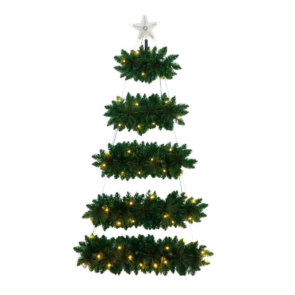 Looking for the perfect space-saving solution for the holidays Meet our new wall-hanging Christmas tree, designed for those hard-to-decorate areas. Think of it as a lighted garland Christmas tree with everything you need for a festive celebration. Pre-lit with 50 energy-efficient LED lights, this battery-operated tree fits seamlessly into any room, regardless of size. Standing 5 ft. tall from top to bottom, it invites creativity-add ornaments, letters, trinkets and other accents to make it truly yours. Display in a studio, cozy nook, as a 2nd Christmas tree, apartment, dorm and other spaces.