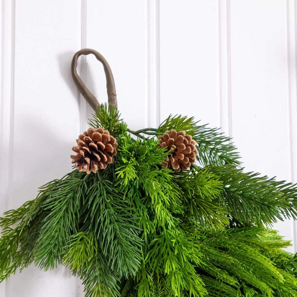 - Mixed pine and norfolk foliage offer a rich, layered look with seasonal charm