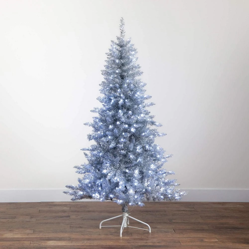 Reminisce on the days of yesteryear where groovy was in and Christmas was en vogue. This artificial silver Christmas tree captures the nostalgic charm of mid-century holiday decor while adding a contemporary cool white LED glow for a modern celebration. Crafted from high-quality materials, the silver finish adds glamour with a vintage twist that complements many decor styles. Pre-strung with 300 cool white LED lights nestled among the tinsel branches, feel the nostalgic radiate your space. Standing 6 ft. from a sturdy stand, create conversation during the holidays. Great for apartments, small spaces, or as secondary trees in larger homes.