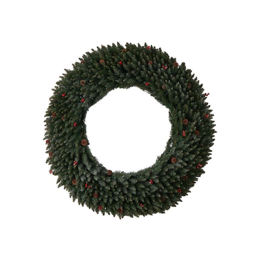 Add the WOW factor to your holiday decor with this flocked artificial Christmas wreath intricately designed from realistic looking pine foliage in a palette of seasonal evergreens flocked in a coat of faux-snow, carefully accented throughout with faux pinecones and berries that look incredibly realistic. Arriving pre-strung with 400 clear LED lights to effortlessly illuminate either a large wall or door, this 5 ft. (in diameter) decorative wreath makes for an inviting accent and will undoubtedly transform any entrance all throughout the holiday season. Perfect for a large space in need of some holiday cheer. Artificial wreaths are manufactured using synthetic materials, such as polyester material or plastic, and are well designed and constructed to be life-like in appearance. This item will need to be re-shaped when removed from the secure box to allow it to reach its fullest size. Your wreath will look beautiful for years to come, simply wipe clean with a soft dry cloth when needed.