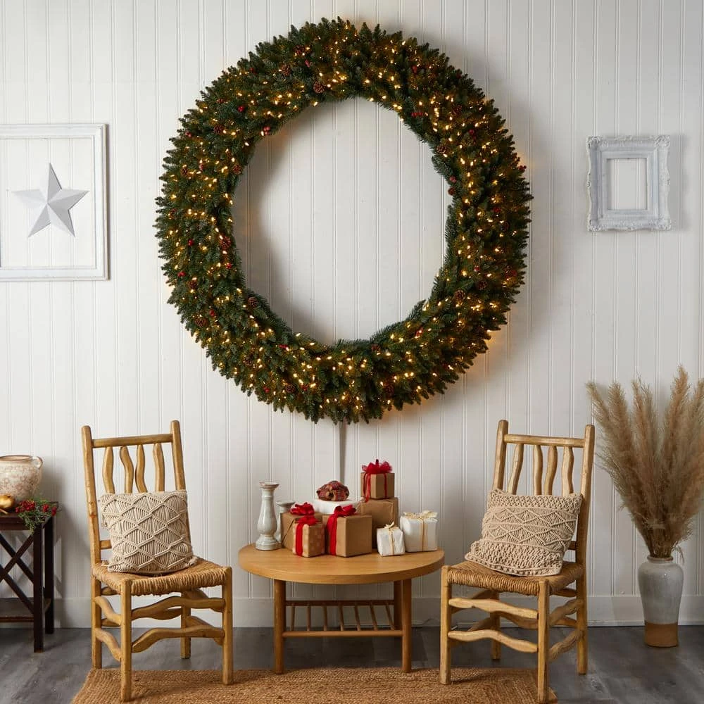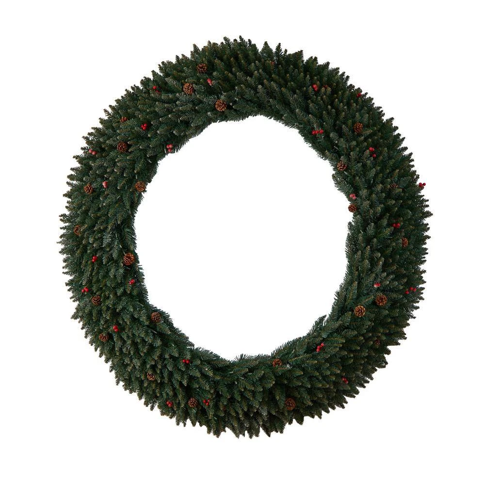 Add the WOW factor to your holiday decor with this flocked artificial Christmas wreath intricately designed from realistic looking pine foliage in a palette of seasonal evergreens flocked in a coat of faux-snow, carefully accented throughout with faux pinecones and berries that look incredibly realistic. Arriving pre-strung with 600 clear LED lights to effortlessly illuminate either a large wall or door, this 6 ft. (in diameter) decorative wreath makes for an inviting accent and will undoubtedly transform any entrance all throughout the holiday season. Perfect for a large space in need of some holiday cheer. Artificial wreaths are manufactured using synthetic materials, such as polyester material or plastic, and are well designed and constructed to be life-like in appearance. This item will need to be re-shaped when removed from the secure box to allow it to reach its fullest size. Your wreath will look beautiful for years to come, simply wipe clean with a soft dry cloth when needed.