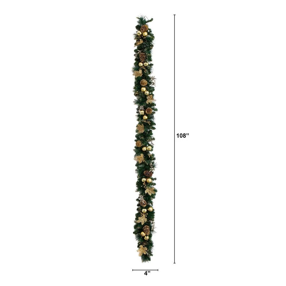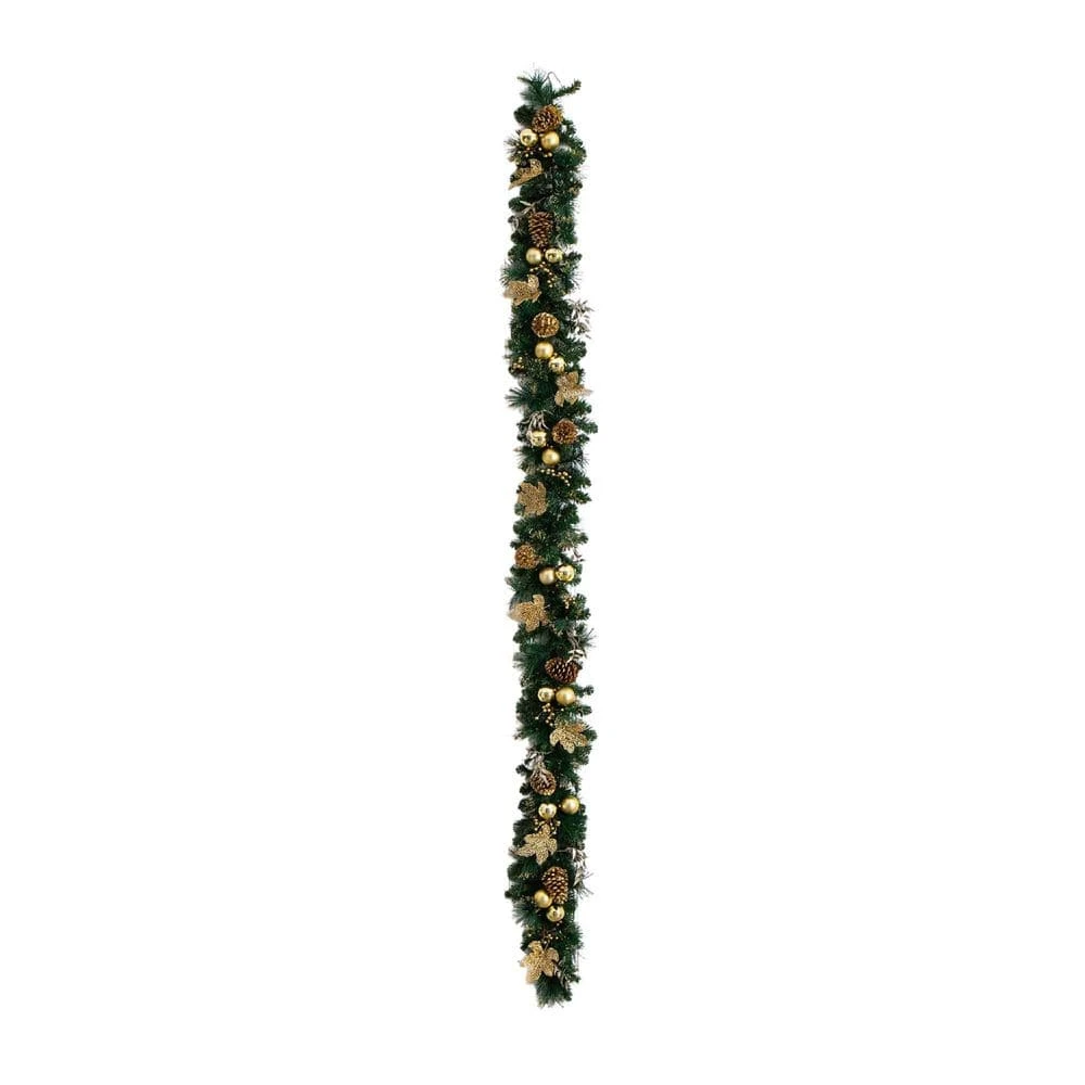 Sometimes all you need is a pre-lit Christmas garland to complete your holiday decor. Inspired by the garlands you grew up with – like the ones at your parents house, this classic, yet traditional piece spreads Christmas cheer wherever displayed. Accented with 50-warm white LED lights, golden frosted green tips, pine cones, berries and balls for a warm, cozy look, hang in any area that needs attention. With a length of 9 ft. it’s great for almost any space. Add the garland for an elevated look and feel.