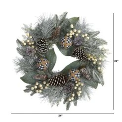24 In. Snow Tipped Holiday Artificial Wreath With Berries Pine Cones And Ornaments